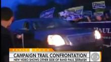 While all three broadcast networks, ABC, NBC, and CBS, highlighted MoveOn.org protestor Lauren Valle being stepped on outside Monday's Kentucky senate debate, only CBS reported new video showing Valle running up to Rand Paul's car and trying to shove a sign into the Republican candidate's face.