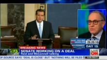 Reid later played up how House Speaker John Boehner could "face a dilemma" if the Senate came up with a compromise to end the shutdown, and that Boehner "can either allow the House to vote, which will likely split the Republican Party in two and create a major backlash from the Tea Party; or...he can refuse to allow a vote, which could lead to default." [MP3 audio available here; video below the jump]