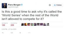As only Piers Morgan could, the liberal former CNN host went on a Twitter rant Tuesday evening complaining that teams not from the United States are unable to compete in the World Series (plus the Toronto Blue Jays, but who’s counting). In a series of tweets starting just after 8:30 p.m. Eastern, Morgan whined that only Major League Baseball (MLB) teams can compete for the title in the Fall Classic before dismissing the sport by touting cricket as “[b]aseball for brainy people anyway.”