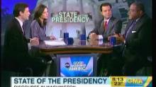 During the intro, ABC also included a segment often seen on the weekend Good Morning America, montages of people summing up their feelings in three words. This version of "In Three Words" was political. As the triumphant music played, the announcer wondered, "With so much at stake, what do Americans want to hear tonight?" Some of the signs featured: "Health care now," "more city jobs" and "public services matter." There were no Tea Party-esque "cut our taxes" declarations.
