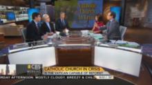 To discuss this topic, CBS anchor Anthony Mason brought in three liberals: Jim Frederick of Time Magazine, the Rev. Paul Raushenbush of the Huffington Post -- the great-grandson of Baptist minister and Social Gospel champion Walter Rauschenbusch -- and Sister Maureen Fiedler, who hosts her own public radio show. All three agreed with the premise that the Catholic Church needs to change. If the message wasn’t clear enough, a screen behind the guests read “Catholic Church in Crisis” (with no question mark) and the chyron read “Catholic Church in Crisis: Is the Vatican Capable of Reform?”