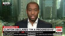 On Wednesday's CNN Newsroom with Carol Costello, during a discussion of the Democratic presidential debate, liberal CNN political analyst Marc Lamont Hill defended Bernie Sanders' socialist views and griped about Hillary Clinton apparently taking a jab at the Vermont Senator as the CNN analyst complained that "she's playing to people's insecurities and fears," and "play[ing] to the cheap seats."