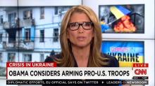 Carol Costello gave an on-air correction on Tuesday's CNN Newsroom concerning an on-screen graphic that aired on the Monday edition of her program: "Yesterday, we ran a story about the debate among Western leaders about whether to send arms to Ukraine. During that segment, our banner mistakenly said, 'Obama considers arming pro-U.S. troops.'"
