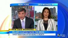 Journalists on all three networks, Wednesday, covered Hillary Clinton talking to reporters for the first time in a month. Yet, ABC's Good Morning America managed to do the story without any Republican critics and with George Stephanopoulos returning to anchor the segment. GMA correspondent Cecilia Vega underlined, "Twenty eight days. That's how long Hillary Clinton went without taking questions from reporters and, believe me, we have been asking."