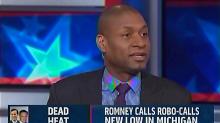 They took on the issue of voter ID laws in various states. Over a montage of still photos of blacks in line to vote, Keller called voter fraud "kind of a tiny problem comapred to voter participation." Blow one-upped Keller, saying "not just a tiny problem I mean, it's minuscule."