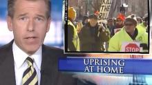 “On the broadcast tonight, the uprising at home,” teased NBC Nightly News anchor Brian Williams, touting “another day of fury in Wisconsin. Workers angry about what they call a plan to balance the budget on their backs.” Williams set up his Friday newscast by equating the left-wing protests with those against Arab dictatorships: “From the Mideast to the American Midwest tonight, people are rising up. Citizens uprisings are changing the world,” he championed, citing what “we’ve witnessed from Tunisia to Egypt” and now Wisconsin where “the state capitol has been taken over by the people.”