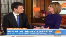Moments earlier, co-host Savannah Guthrie excused the Obama administration's poor handling of the situation: "So what is the White House supposed to do? I mean, on Friday we see the President coming out saying to Putin, 'There will be high costs if you invade.' The very next day, he invades. What leverage do we have?" Remnick replied: "Economic leverage, diplomatic leverage, but I don't think in any way the United States or Europe has any interest in making this military, making it a military clash between the United States and Russia, because we know how horrible and bloody that could get."