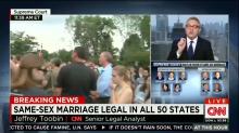 It was obvious on Friday that CNN reporters and analysts were giddily celebrating the Supreme Court's liberal ruling bolstering same-sex marriage, but CNN legal analyst Jeffrey Toobin was perhaps the only one who inadvertently admitted that "we celebrate" the trend toward gay rights victories before immediately catching his faux pas with laughter and walking it back to "many people celebrate" as he predicted the next target of the gay rights movement.