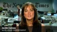 The New York Times is milking its latest poll, showing some good news for Obama, to maximum effect. Sunday's front-page featured a poll story from one of the paper's top Obama boosters, White House correspondent Jackie Calmes (pictured): "Challenged on Medicare, G.O.P. Loses Ground." Text box: "Polls Show Favor for Obama on Issue of Party Trust." Calmes writes from Orlando: