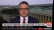Liberal CNN legal analyst Jeffrey Toobin attacked Governor Asa Hutchinson on Wednesday's At This Hour, after the Arkansas Republican asked the state legislature to bring a proposed Religious Freedom Restoration Act closer to the original 1993 federal law: "This was political double-talk....The idea that you can compromise and find some language that allows people to not do business with gay people; and also, protect them...from discrimination, it's just impossible. There are no compromises available here."