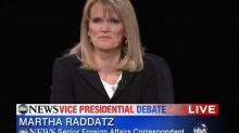 Martha Raddatz’s friends in the media are swooning over her performance in last night’s Vice Presidential debate. And certainly she deserves a good deal of credit for taking Joe Biden to task for the Obama administration’s failures in Benghazi. She asked the hard, pointed questions that the administration has managed to dodge for weeks. Her conduct during the opening segment was refreshing and professional.