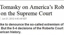 Tomasky's piece is laughably predictable in its foaming-at-the-mouth rhetoric -- Scalia, he tells us, belongs on a "marginal rubber-chicken circuit" rather than "on the highest court in the land imposing his 16th-century will on the rest of us" -- but it's also built upon some distortions of what the Roberts Court has actually done in some "hot-button" 5-4 cases.