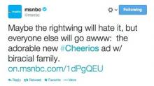 Less than a month after Melissa Harris-Perry's tear-drenched apology for a panel discussion on her MSNBC program which mocked Mitt Romney's adopted black grandson, the cable network again had to apologize on Wednesday, this time for an online post (now deleted) that unjustly accused conservatives of being against interracial marriage and reproduction. An anonymous writer on MSNBC's official Twitter account wrote: "Maybe the rightwing will hate it, but everyone else will go awww: the adorable new #Cheerios ad w/ biracial family."