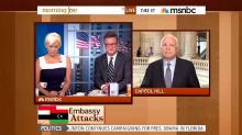 McCain was asked by Scarborough whether or not Governor Romney should have waited several days to hold a press conference on Libya and Egypt, prompting the Senator to comment that he wasn't about to give Romney tactical campaign adivce and that "the fact is the United States in the Middle East is weak" under Obama and that Romney had to address "the big picture." [See video below break. MP3 audio here.]
