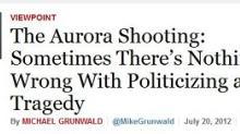 Michael Grunwald is doubling down on what many liberals in the media are only hinting at. "[T]here is nothing wrong with politicizing tragedy," the Time senior national correspondent wrote this morning, reacting to the Aurora movie theater shooting. "If advocates or experts or even politicians think their policy ideas can prevent the next Aurora—by preventing potential killers from obtaining guns, by making sure potential victims can carry guns, or by some other method—then by all means, now is the time to spread the word."