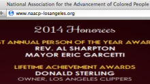 It turns out that Sterling must be known in liberal and politically correct circles for far more than the few small political donations from two decades ago identified in last night's post. The Clippers owner is scheduled in less than three weeks to receive a lifetime achievement award from the Los Angeles chapter of the NAACP at its 100th anniversary event, where Al Sharpton and LA Mayor Eric Garcetti will also be honored as persons of the year (HT to a NewsBusters commenter):