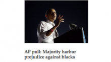 That's the conclusion communicated by AP reporter Sonya Ross and wire service deputy director of polling Jennifer Agiesta. In case we don't get the point, the item's accompanying photograph at the AP national site, Yahoo News and likely elsewhere is of Barack Obama, who despite the recognized and unrecognized racism of most Americans managed to carry 53% of the vote in 2008. Contrary to the report's headline, the AP pair admit that the AP-GfK poll results alone (done online, to add insult to injury) don't prove the point they're trying to make; other bizarre tests are also involved.