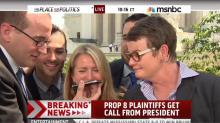 The folks at MSNBC were ecstatic this morning following the Supreme Court’s invalidation of the federal Defense of Marriage Act (DOMA), but that joy exploded to Chris Matthews levels of tingledom during the 11:00 a.m. hour when President Obama decided to call the couple who took the Prop 8 case to court while they were being interviewed by network anchor and outspoken same-sex marriage advocate Thomas Roberts. [See video after jump. MP3 audio here.]