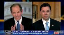 While questioning Rep. Jason Chaffetz (R-Utah) over the budget battle on Monday's "In the Arena," CNN's Eliot Spitzer switched gears and attacked Republicans for cutting taxes for the rich while cutting benefits for the poor. Spitzer and Chaffetz sparred over the ongoing budget battle and spending cuts, and Spitzer was certainly not lacking in Democrat talking points.