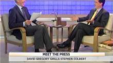 In a fawning interview with liberal comedian Stephen Colbert on Sunday's Meet the Press, moderator David Gregory praised the Colbert Report host and Daily Show host Jon Stewart: "Why do you think so many people think you and Jon Stewart are more effective at exposing hypocrisy, getting to real truths, than the – than the news media is?"