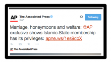 Sarah's and Abu's long-term relationship culminated in a Tuesday afternoon story which AP condensed into 140 characters on Twitter as follows: "Marriage, honeymoons and welfare: @AP exclusive shows Islamic State membership has its privileges." A great deal of justified outrage has followed the release of El Deeb's dispatch for "romancing the Stone Age" by glorifying the advantages accruing to an Islamic State jihadist. More attention needs to be paid to her history with al-Homsi, and her "reporting" in general.