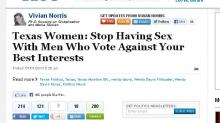 Deeply disgruntled that Texas might pass a bill banning abortions after 20 weeks, Norris urged Texas women to force men to vote for pro-choice agendas in the future by refusing to have intercourse with them this summer. “Don't give in if your man, boyfriend, husband, toyboy is not voting for your best interests, your reproductive health -- do not sleep with that man!” ranted Norris. “I don't care how cute or charming he is! I don't care if he is your husband of many years. Resist! Go swimming! Meditate!”