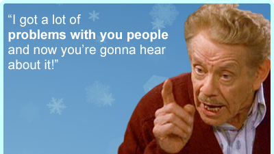 As we all know from Seinfeld, December 23 is the date in which a thoroughly frustrated Frank Costanza invented Festivus, a bare-bones non-commercial holiday "for the rest of us." One of the Festivus festivities is the Airing of Grievances, so have at it people! What's really got you hot under the collar?