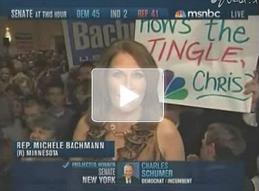 Michele Bachman took every thing Chris Matthews had tonight and punched back, during her live election night MSNBC interview with the Hardball host. After a frustrated Matthews actually asked the Congresswoman if she was "hypnotized" and in a "trance" for not answering his questions the way he liked, Bachmann fired back: "The American people are the ones...coming out of our trance...I think people are thrilled tonight. I imagine that thrill is probably maybe quite not so tingly on your leg any more."