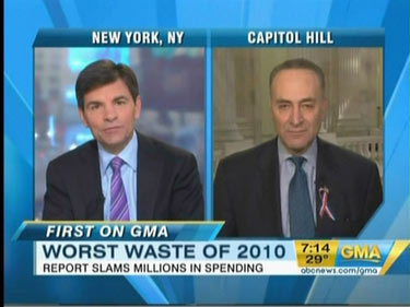 On Monday's Good Morning America, ABC's George Stephanopoulos took a skeptical tone during an interview of liberal Senator Chuck Schumer concerning a new report from Senator Tom Coburn, which pointed out the 100 most wasteful federal government projects of 2010: "He [Coburn] says there are hundreds of billions of dollars of waste. Do you buy that?"