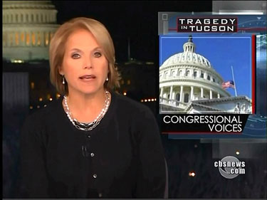 Couric questioned attempts to blame the shooting on conservative speech: "Was it appropriate in the immediate aftermath of this event, by some people, to blame right-wing rhetoric?" Schultz claimed: "No one's blaming right-wing rhetoric but that we all agree that the language and the tone and the tenor of our debate has gotten too intense and that we need to lead by example."