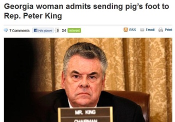 A Muslim woman has admitted to mailing a bloody pig’s foot and a threatening letter to Rep. Peter King (R-N.Y.), as well as another bizarre package to a New York state senator.