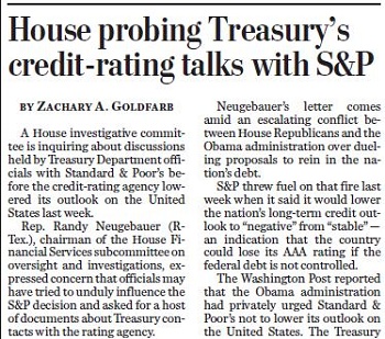 Last week I noted how the Washington Post published on page A5 a story about how Obama Treasury officials tried but failed to influence Standard & Poor's credit analysts from downgrading the U.S. government's credit outlook from "stable" to "negative."