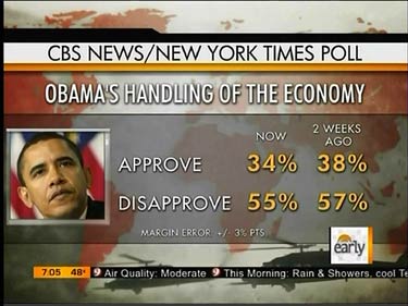 On Wednesday, a CBS News/New York Times poll found that the President's overall approval rating jumped 11 points to 57%, just days after a Navy SEAL raid killed Osama bin Laden in Pakistan, but his approval rating specifically on the economy dropped 4 points to an all-time low of 34%.