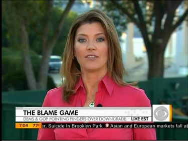 On Monday's Early Show, CBS's Norah O'Donnell promoted the left-of-center talking point that Standard & Poor's recent lowering of the U.S.'s credit rating is a "Tea Party downgrade." O'Donnell played three sound bites of notable liberals using this line of attack, versus only one opposing from a center-right politician. She also spun Treasury Geithner's decision to stay as "good news for the President."