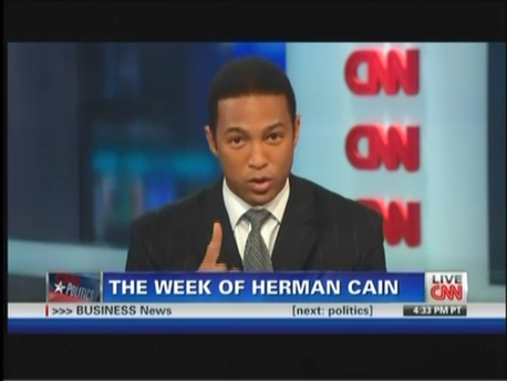 So Cain is borderline racist for thinking blacks are brainwashed by Democrats, but it is "outright fantastical" for him to claim he's going to get 30 percent of the black vote. Neither Lemon nor his guest noticed the irony:
