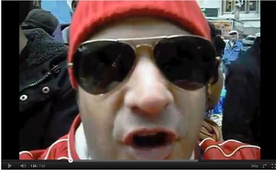 One positive thing to say about "upchuck" is that he has enough fashion sensibility to know that when you loudly curse out capitalism, a pair of designer Ray Ban Classic Aviator sunglasses, which sell for $139 at Neiman Marcus, is an obligatory eyewear accessory. Also note the many OWS souvenir vendors at Zuccotti Park, one of whom attempted to sell a $10 pin to upchuck. When you are done counting the number of new North Face parkas in that "anti-capitalist" crowd stand by for some incredible comedy gold at the 3:30 mark when upchuck delivers a command perfomance of his OWS dance.