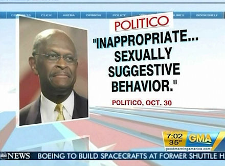 Since the Herman Cain sexual harassment story broke late Sunday night, the broadcast networks have covered it extensively: full stories on Monday's morning news shows (ABC's Good Morning America led off their broadcast); full stories on Monday's evening news shows (the CBS Evening News made it their top item) and ABC's Nightline; and the top story on all three Tuesday morning shows.