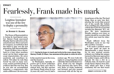 "Fearlessly, Frank made his mark," blared the below-the-fold Style section front page article by Robert Kaiser. "Longtime lawmaker was one of the few to display a personality," the subheader approvingly noted.