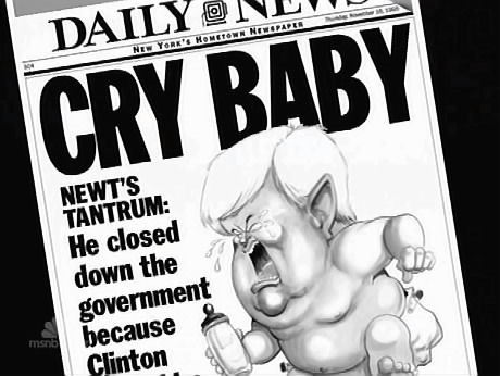 Regurgitating the biased media line at the time which blamed Republicans over President Bill Clinton (MRC MediaWatch study), Myers claimed “twice Gingrich shut down the government.” Using contemporaneous biased coverage to justify her retrospective, Myers plastered on a screen a New York Daily News headline with matching caricature, “CRY BABY: NEWT’S TANTRUM.” She explained: “Gingrich generated this headline, after suggesting that he shut down the government because the President made him sit in the back on Air Force One.”