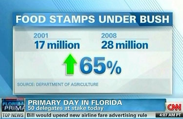 In contrast, that number grew about the same amount during eight years of President Bush – over double the number of years Obama has held office. Around 6 percent of Americans benefitted from SNAP (Supplemental Nutrition Assistance Program) at the outset of Bush's term, and that number climbed over eight years to 10.4 percent in January of 2009.
