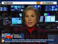 After MSNBC host Ed Schultz gave her the chance to respond to complaints from conservatives that liberals have shown a double standard in tolerating vile comments about conservative women from liberals like Bill Maher while attacking Rush Limbaugh's recent controversial "slut" comment, Schakowsky admitted that disagreement with Limbaugh's political agenda was a major motivation for her rather than his simply using the word "slut."