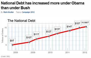 CBS's Mark Knoller reported Monday evening at CBSNews.com that "The National Debt has now increased more during President Obama's three years and two months in office than it did during 8 years of the George W. Bush presidency." "The Debt rose $4.899 trillion during the two terms of the Bush presidency. It has now gone up $4.939 trillion since President Obama took office," the veteran White House correspondent noted.
