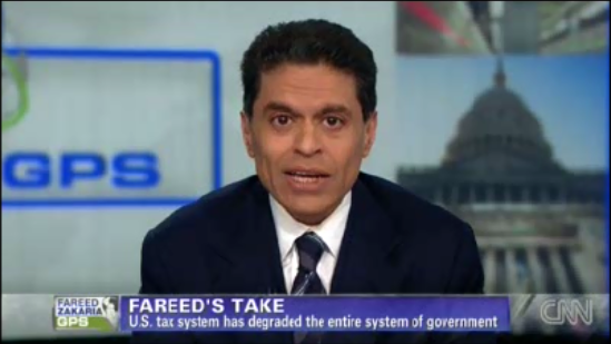 On CNN's Fareed Zakaria GPS Sunday, the perilously liberal host actually complained about America's tax code being too progressive while noting, "The top ten percent in America pay a larger share of total taxes, 45.1%, than do the top ten percent in any of the 24 countries examined" (video follows with transcript and commentary):
