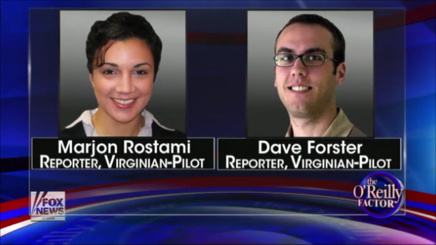 According to a LexisNexis search of the names Rostami and Forster, apart from O’Reilly, only CNN has covered this story, and that coincidentally was Howard Kurtz on Sunday’s Reliable Sources addressing why the Virginian-Pilot didn’t report the incident sooner. There was absolutely no mention of the national media’s lack of coverage or the fact that up until that point, his own network hadn’t said a word about the matter.
