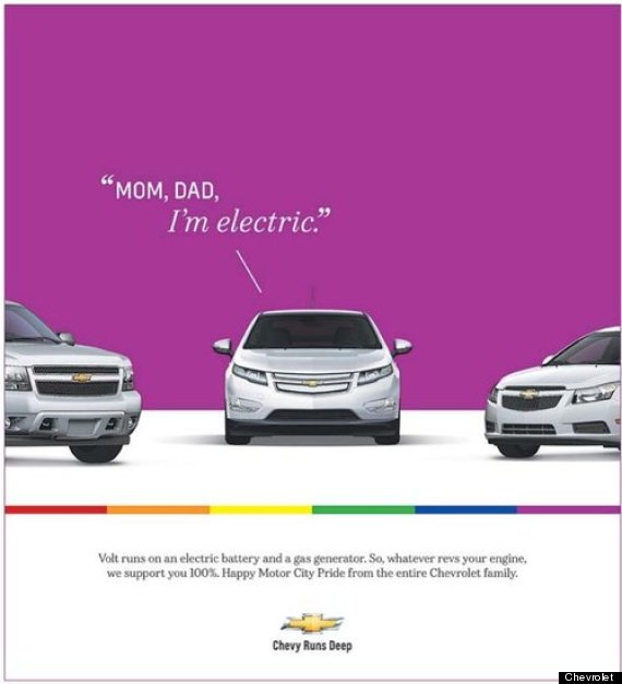 An LGBT Detroit based paper, Between the Lines, ran an ad showing the Chevy Volt taking the most important step in a gay person’s life, coming out. Parked between two gas powered Chevy vehicles, the ad shows the Volt boldly proclaiming, “Mom, Dad, I’m Electric.”