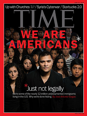 In front of a picture of unknown immigrants save the story's controversial author Jose Antonio Vargas was the bold headline "We Are Americans*"; somewhat below it read "*Just not legally."