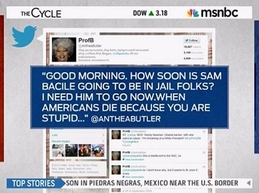 The liberal panelists of MSNBC's The Cycle did their level best to help University of Pennsylvania religion professor Anthea Butler defend her now infamous tweet that the filmmaker behind the "Innocence of Muslims" video trailer on YouTube should be throw in jail. Co-host Toure Neblett went so far as to denounce the Twitter "mob" that deluged Butler's Twitter account with critical tweets. Only conservative S.E. Cupp pushed back against Butler by insisting that the YouTube video was a fig leaf justification by Islamists for violence.