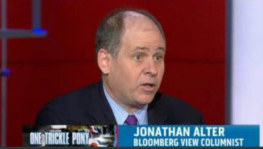Alter laughably suggests that for Obama to cite this bogus claim would "explain more" of Romney's tax plan. Obviously it would explain less, based on the premise that the less said about Romney's plan, the better. Imagine the febrile reaction at MSNBC if any Romney surrogate made the comparably dishonest claim that Romney's tax plan would cut taxes only for the middle class.