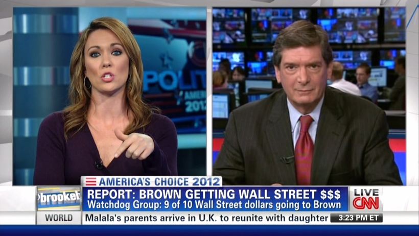 Reporting on the Massachusetts Senate race on Thursday, CNN's Brooke Baldwin played a Democratic card by noting the amount of Wall Street money Republican incumbent Scott Brown's campaign receives compared with his Democratic challenger Elizabeth Warren, who has campaigned as a populist opponent of Wall Street.