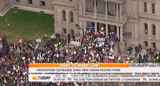 DIANE SAWYER: And now, we turn to that showdown raging in the heartland of the United States. Perhaps no place in America more closely associated with unions than the state of Michigan. And today, thousands of union workers descended on the capital to protest a new law they believe could be an ominous signal for unions and worker paychecks everywhere. Here's ABC's Alex Perez.